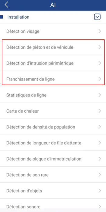 Desde este menú, selecciona "Instalación" para mostrar el menú desplegable. Aquí encontrarás las tres principales funciones inteligentes (compatibles con la mayoría de cámaras Gigamedia):
