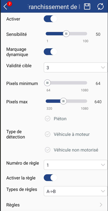 Reglas: Permite configurar la línea o área de detección (visible solo si el rango de detección está configurado como "Personalizado").