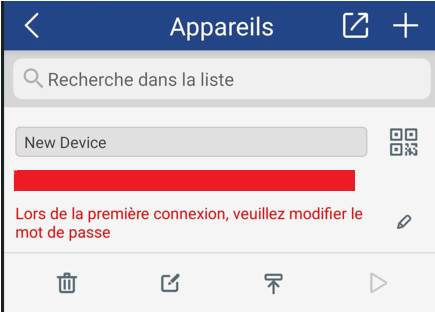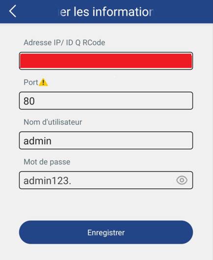 Une fois le QR code scanné, l’application affichera une nouvelle page avec l’adresse IP / l’ID, le port et le nom d’utilisateur déjà renseignés. Il vous suffira d’ajouter le mot de passe par défaut de l’enregistreur : admin123.