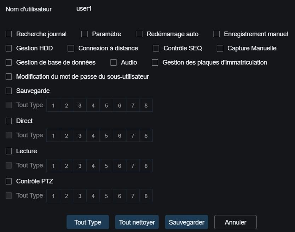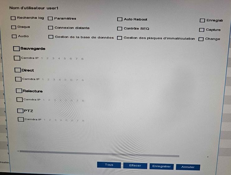 L'utente di livello Amministratore ha pieni diritti e non può essere modificato. Questa interfaccia ti permette di definire chi avrà accesso alle diverse funzioni (parametrizzazione, riproduzione, ecc.).